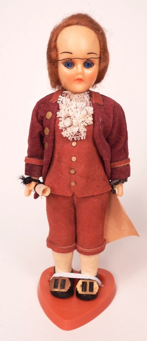 This is a Carlson Benjamin Franklin doll, number 8-121. He has also been seen with a brown jacket with a tan vest and pants, in a red jacket, vest and pants, and in a turquoise jacket with a tan vest and pants.