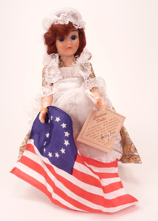 This is a Carlson Betsy Ross doll, #8-120. The Betsy Ross dolls I have seen all have the same basic dress with a white pinafore, but with different dress colors and patterns. The known variations are listed below: