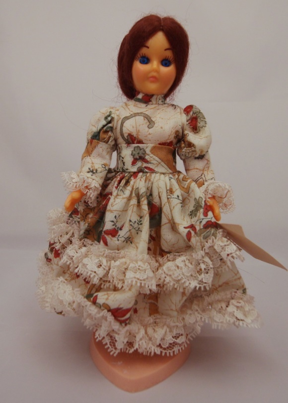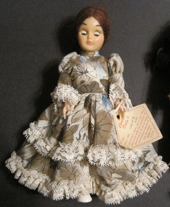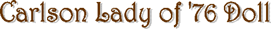 This is a Carlson Lady of '76 doll, number 8-124. This doll wears a calico dress with white lace trim. It is likely this doll comes with other dress colors.