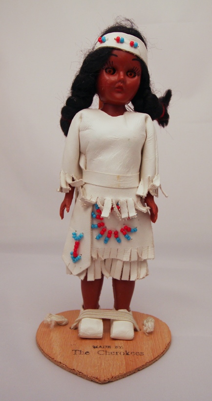 This doll is from the "Made by the Cherokees" dolls. She comes with a wooden heart shaped stand, and originally had a tag stamped with the name of the person who assembled her.