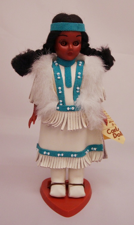 This is a Carlson Minnehaha doll. She has a white leather dress with turquoise suede details and beading. The white fur trim is artificial. The tag on this doll is signed by Ann Carlson.Very pretty doll!