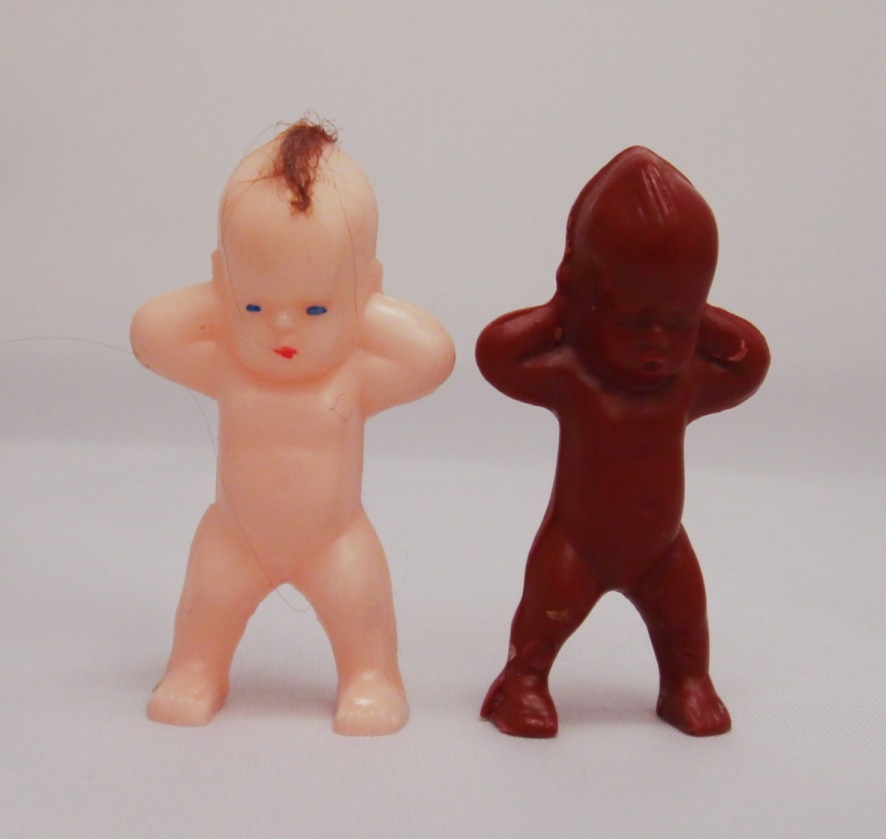 These are the Native American and Caucasian versions of the papoose dolls without their perspective bunting. The Native American version came with many 7.5 and 11 inch Carlson dolls. The Caucasian version only came with the Frontier Lady , as far as I know. The Native American is unpainted, but the Caucasian one will have painted eyes, mouth and a tuft of glued hair.