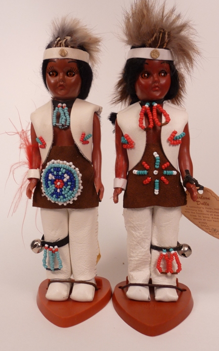 These are two versions of the Pawnee Hoop Dancer dolls, number 20-102. The one on the left is the newer version with a sewn cloth tag. The one on the right has the older paper hang tag. These are the only variations of this doll I have seen.