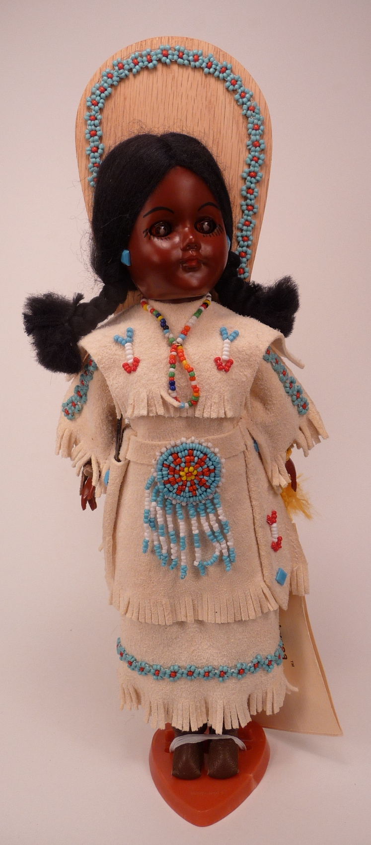 This in the middle size of the Sacajawea dolls from Carlson, at 11" tall, #11-202. She is also available in the 7.5" and 18" sizes. I believe she is missing a walking staff.