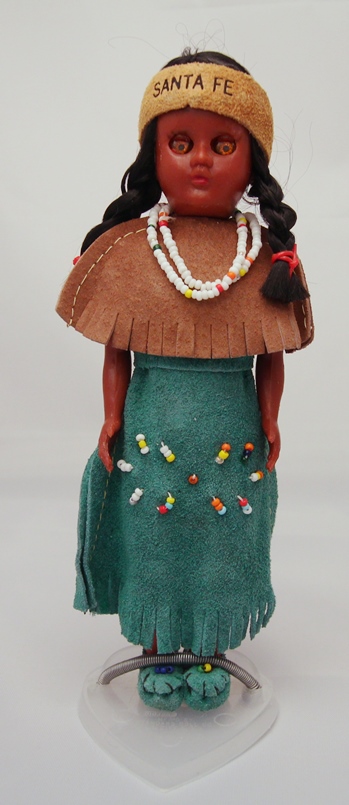 This is a souvenir Indian doll from Santa Fe. This is somewhat lower quality than the Carlson Dolls, though her dress is real leather. Her headband is labeled Santa Fe; most likely this same doll was sold at many locations with different headband labels.