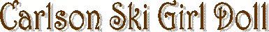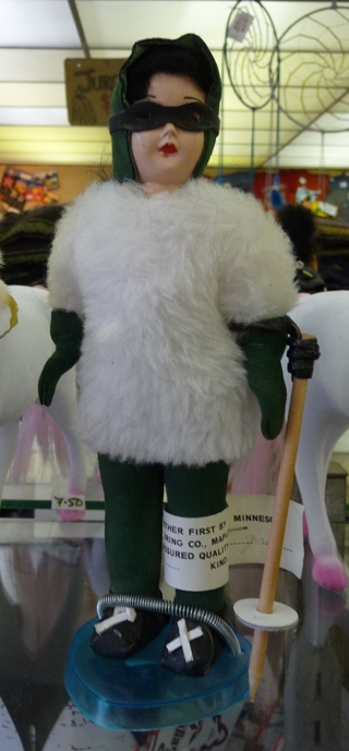This is a Carlson "Ski Girl" doll. Her outfit is green suede with white faux fur. I believe she is missing one of her poles. There is also a version of her as a blonde with a pink fur parka and black leather pants.