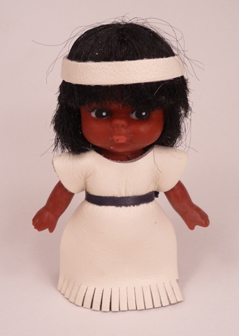 This is a Carlson Indian Toddler doll. I have seen her in brown, blue and red leather dresses as well; she may have been sold with a basket bed.These dolls are used as papooses for the very large format dolls.