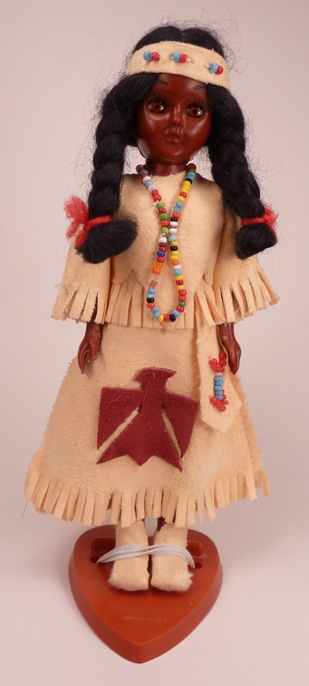 This doll appears very similar to Carlson dolls, but I do not believe she is. The face and design aspects are very similar, but her dress is artificial suede, which had begun to degrade, shedding white dust when rubbed. Also, her body mold has slimmer legs than the carlson dolls. The stand does not belong to her.