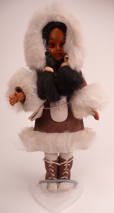 I do not know the name or manufacturer of this doll. She is lighter-skinned than the Carlson Indian dolls. Her outfit is suede trimmed with faux fur.