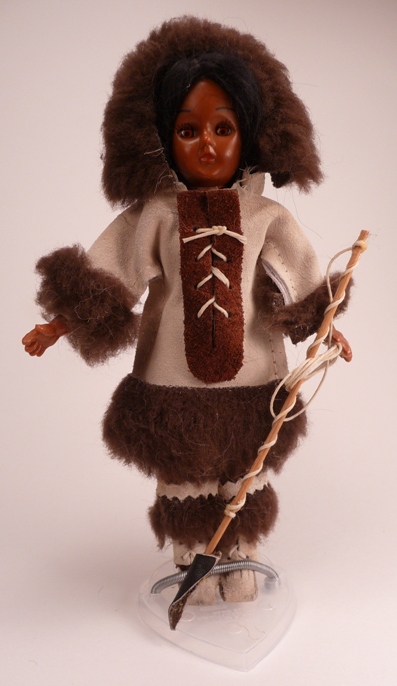 I do not know the name or manufacturer of this doll. He is lighter-skinned than the Carlson Indian dolls. His outfit is suede trimmed with faux fur.