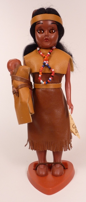 This is a Carlson Wichita Princess doll, number A820. I believe she may come in other colors of clothing, but cannot confirm this. I believe I may have a brown and turquoise suede version of this doll in storage.